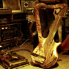 Vous pouvez voir ici différents outils de travail de l'artiste : alasoir, gouje, wastrigue, poite à âme, petit rabot